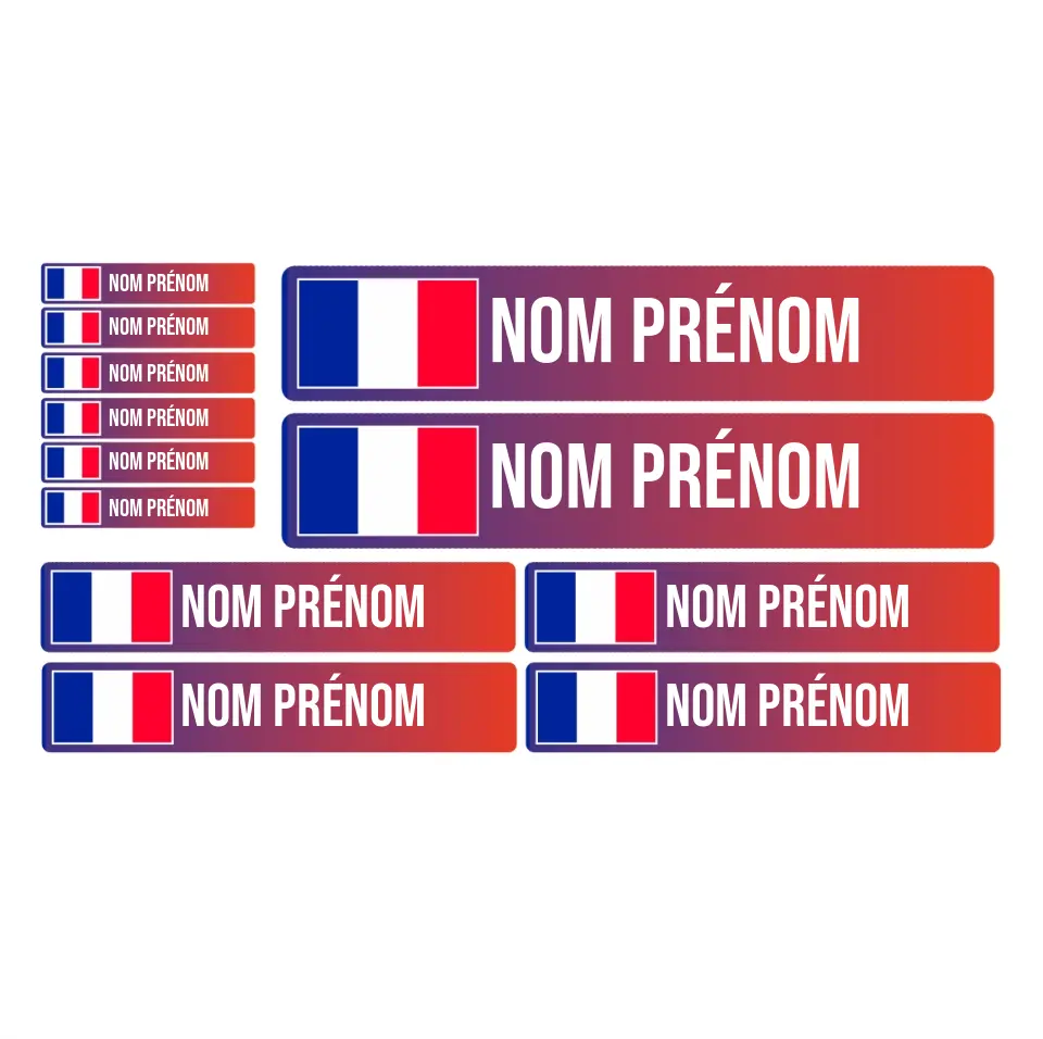 Les stickers vélo nom avec drapeau personnalisés offrent une manière unique d'exprimer votre identité et votre patriotisme tout en ajoutant une touche personnelle à votre vélo. Que vous soyez un cycliste passionné ou un compétiteur chevronné, ces autocollants vous permettent de mettre en avant votre nom et de représenter fièrement votre pays lors de vos sorties à vélo. Grâce à notre large gamme de stickers vélo personnalisés, incluant des drapeaux nationaux et une variété de designs, vous pouvez créer un look distinctif pour votre vélo, que ce soit pour le cadre, le casque ou toute autre surface. En plus d'ajouter du style, ces stickers offrent également une fonction pratique en rendant votre vélo facilement identifiable. Optez pour des stickers de qualité qui résistent aux intempéries et restent en place même sur les terrains les plus exigeants. Avec nos autocollants pour vélo, vous pouvez afficher votre nom et votre drapeau avec fierté, tout en ajoutant une touche personnalisée à votre équipement.