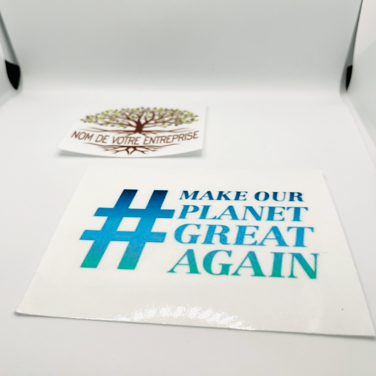 Pour nos stickers personnalisés, nous utilisons un vinyle recyclé à base de bouteille plastique très durable et résistant.