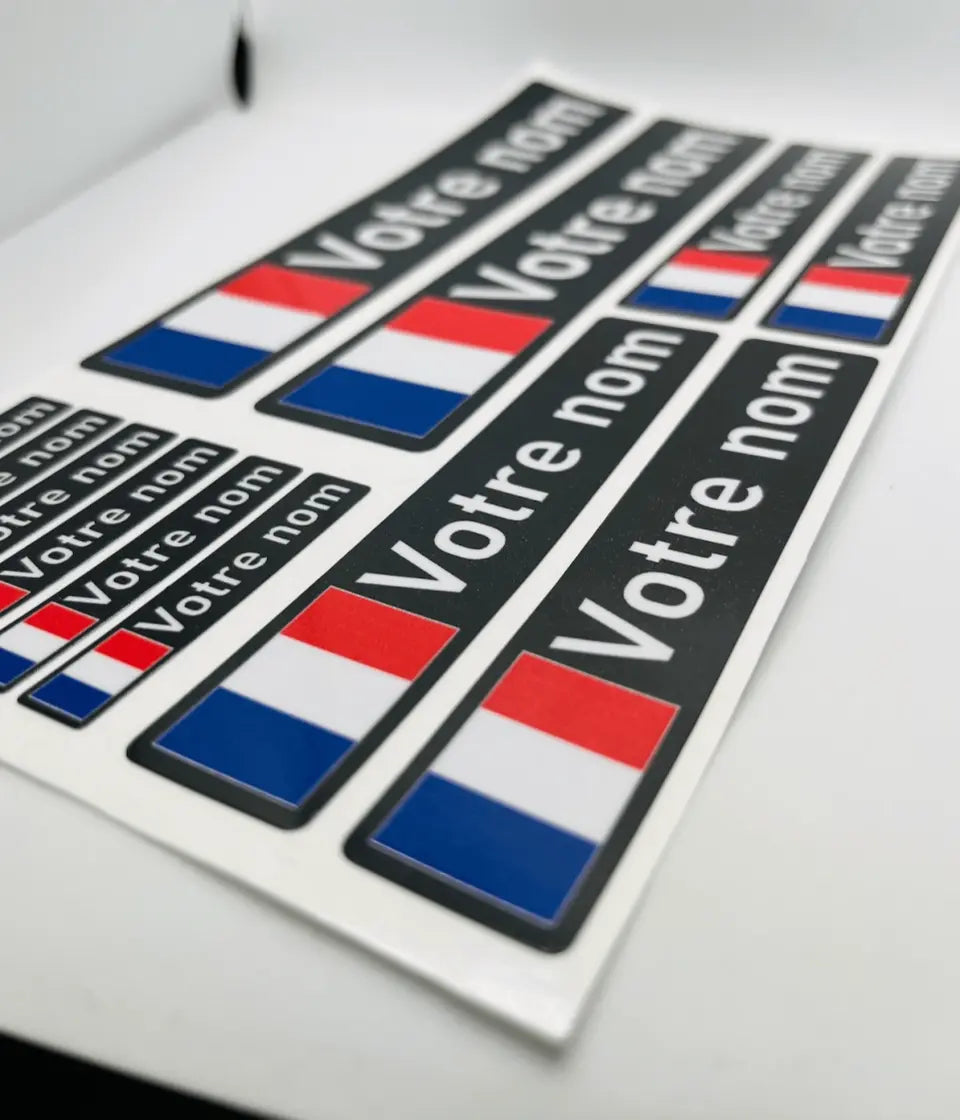 Les stickers vélo nom avec drapeau personnalisés offrent une manière unique d'exprimer votre identité et votre patriotisme tout en ajoutant une touche personnelle à votre vélo. Que vous soyez un cycliste passionné ou un compétiteur chevronné, ces autocollants vous permettent de mettre en avant votre nom et de représenter fièrement votre pays lors de vos sorties à vélo. Grâce à notre large gamme de stickers vélo personnalisés, incluant des drapeaux nationaux et une variété de designs, vous pouvez créer un look distinctif pour votre vélo, que ce soit pour le cadre, le casque ou toute autre surface. En plus d'ajouter du style, ces stickers offrent également une fonction pratique en rendant votre vélo facilement identifiable. Optez pour des stickers de qualité qui résistent aux intempéries et restent en place même sur les terrains les plus exigeants. Avec nos autocollants pour vélo, vous pouvez afficher votre nom et votre drapeau avec fierté, tout en ajoutant une touche personnalisée à votre équipement.