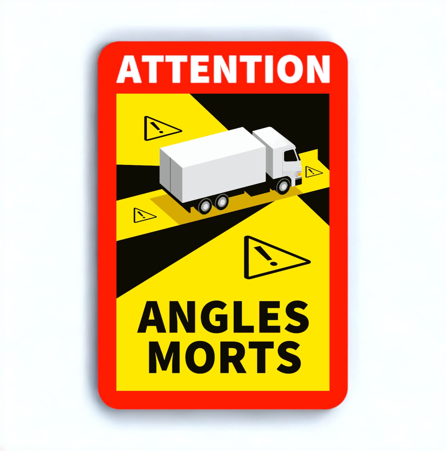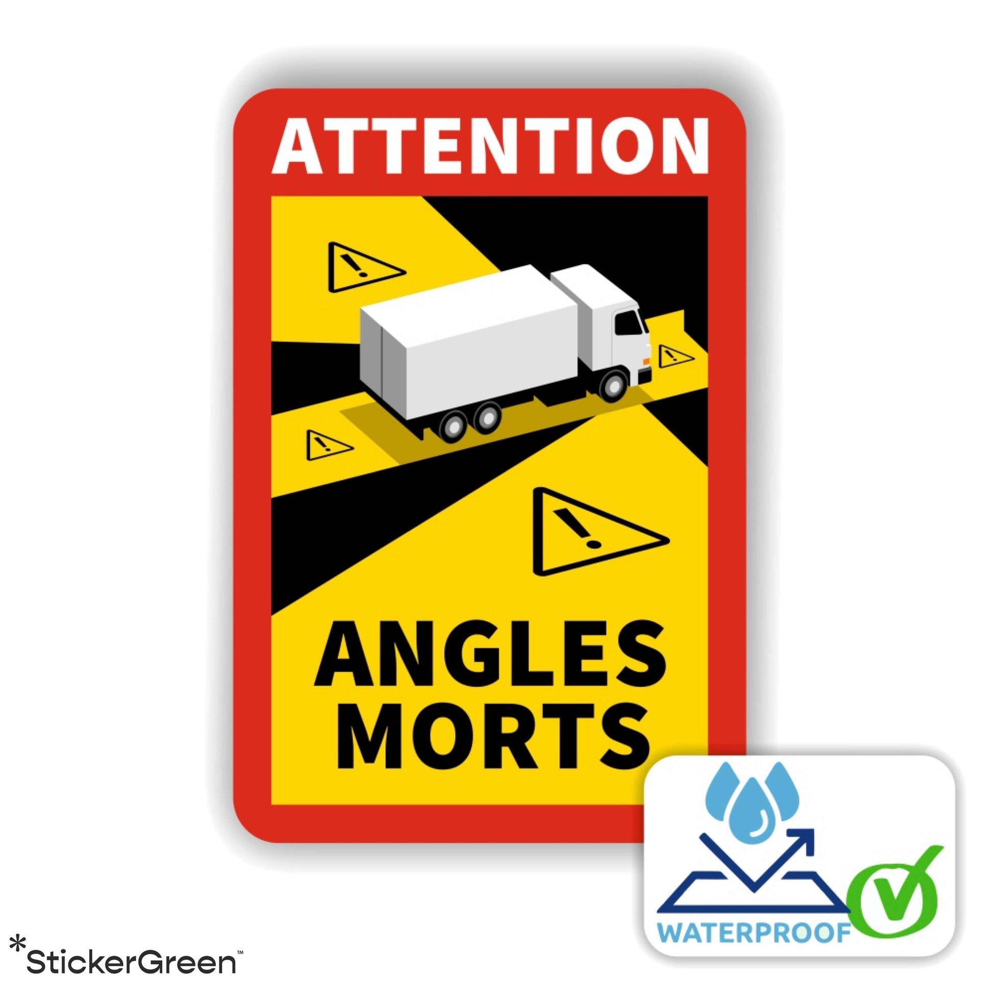 En Hexagone, dès le 1er janvier 2021, il est impératif d'arborer des stickers d'angle mort sur les véhicules excédant 3,5 tonnes. Ces adhésifs sont apposés sur les véhicules afin de sensibiliser les conducteurs à cette zone de visibilité réduite. L'angle mort désigne la zone périphérique d'un véhicule invisible dans les rétroviseurs latéraux et arrière.